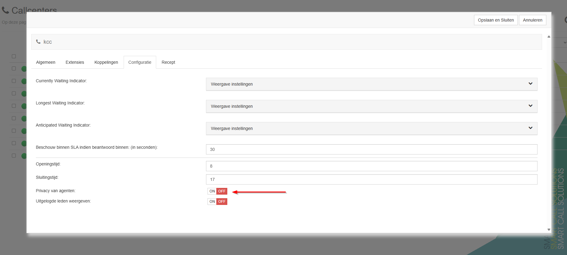 - Open de details van de callcenter.